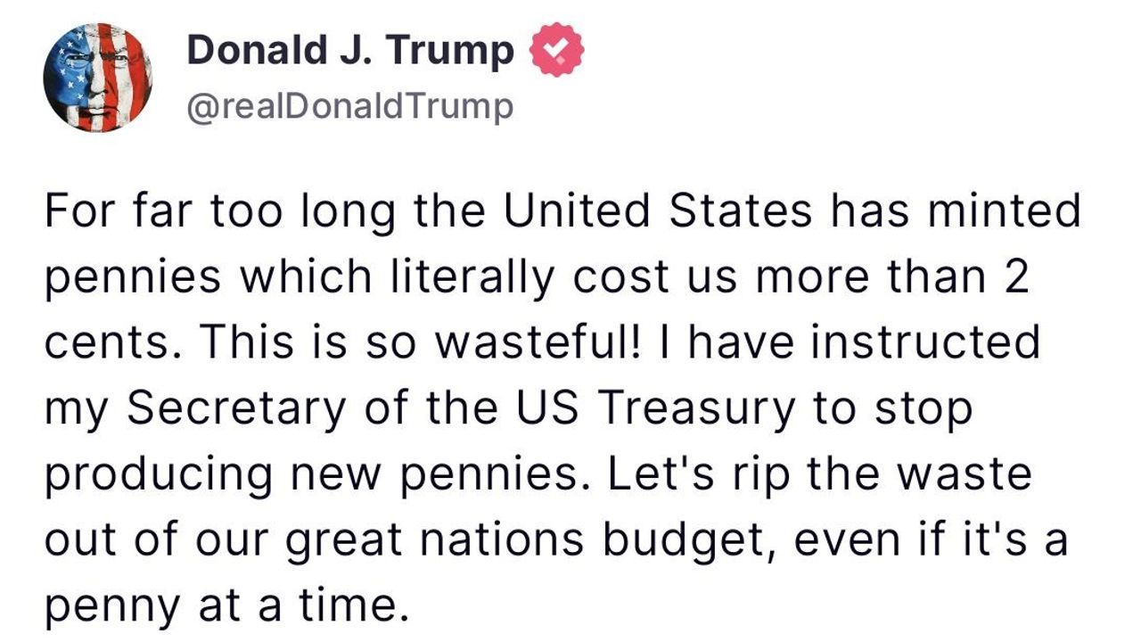 Kendisine ait Truth sosyal medya platformu üzerinden açıklama yapan Trump, ülkede kullanılan bazı bozuk paraların üretim maliyetinin fazla olmasını eleştirdi. "Amerika Birleşik Devletleri çok uzun zamandır bize 2 sentten daha pahalıya mal olan bozuk paralar basıyor" diyen Trump, "Bu çok büyük bir israf" ifadelerini kullandı. Bu nedenle, ABD Hazine Bakanı Scott Bessent’e yeni "peni" üretimini durdurma talimatı verdiğini açıklayan Trump, "Her seferinde bir 'peni' bile olsa, yüce ulusumuzun bütçesindeki israfı ortadan kaldıralım" ifadelerini kullandı.