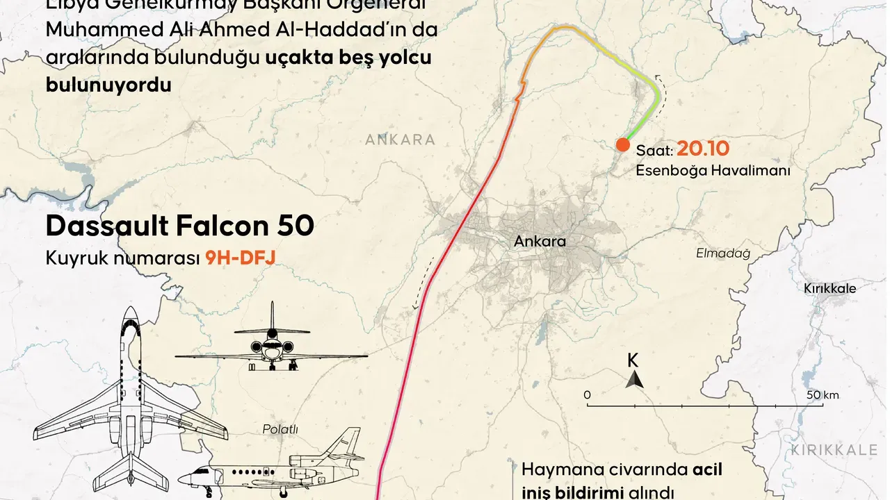 Ankara’dan Trablus’a gitmek üzere havalanan ve Libya Genelkurmay Başkanı Muhammed Ali Al-Haddad ile beraberindeki heyeti taşıyan özel jetin Haymana ilçesine bağlı Kesikkavak mevkisinde düşmesine ilişkin soruşturma sürüyor. Kazaya dair ilk teknik bulgular, uçağın düşmeden hemen önce genel elektrik arızası yaşadığını ortaya koydu.