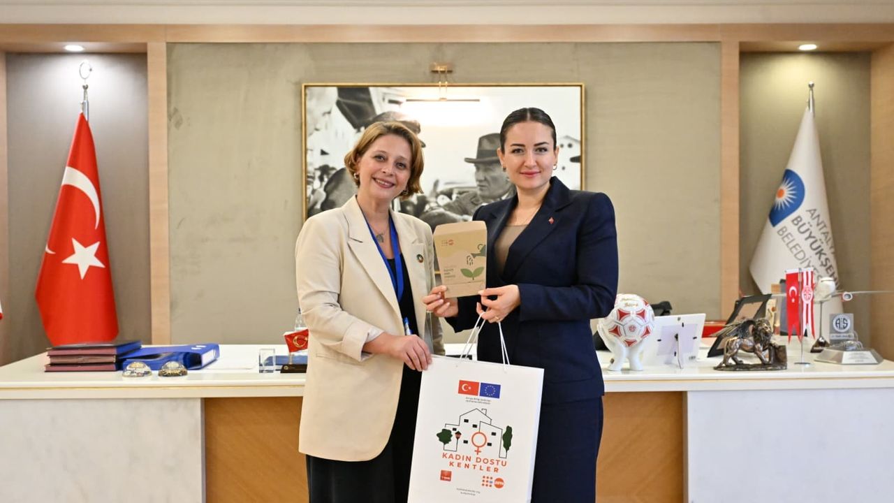 Antalya Büyükşehir Belediyesi, Dışişleri Bakanlığı Avrupa Birliği Başkanlığı koordinasyonunda Avrupa Birliği’nin finansal desteği, Birleşmiş Milletler Nüfus Fonu, UNFPA’in yürütücülüğünde Türkiye Belediyeler Birliği ortaklığıyla yürütülen ‘Kadın Dostu Kentler III’ programı kapsamında çalışmalar sürüyor. Antalya Büyükşehir Belediyesi Başkan Vekili Büşra Özdemir, "Kadın Dostu Kentler III" programı kapsamında Birleşmiş Milletler Nüfus Fonu (UNFPA) yetkilileri ile bir araya geldi. UNFPA Türkiye Kadın Dostu Kentler Programı Yöneticisi Özlem Çalışkan ve Saha Koordinatörü Naz Hıdır ve heyet, Başkan Vekili Özdemir’i ziyaret ederek, yürütülen programı değerlendirdi. Kadın Dostu Kentler III Programı’na 25 pilot ilden biri olarak seçilen Antalya Büyükşehir Belediyesi’nin yaptığı çalışmaların ele alındığı ziyarette, program kapsamında 30 Kasım 2027 yılına kadar yürütülecek faaliyetler konuşuldu.
