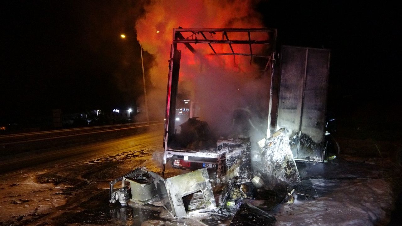 Antalya’nın Manavgat ilçesinde seyir halindeki nakliye aracı alev alev yanarak küle döndü, içerisindeki çok sayıda elektronik eşya kullanılamaz hale geldi.