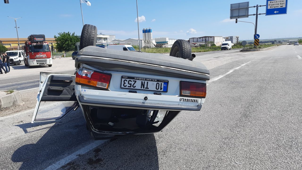 Gönen'de bir otomobil, kırmızı ışığa takla atarak yoldan çıktı; sürücü ve yolcu hafif şekilde yaralandı.