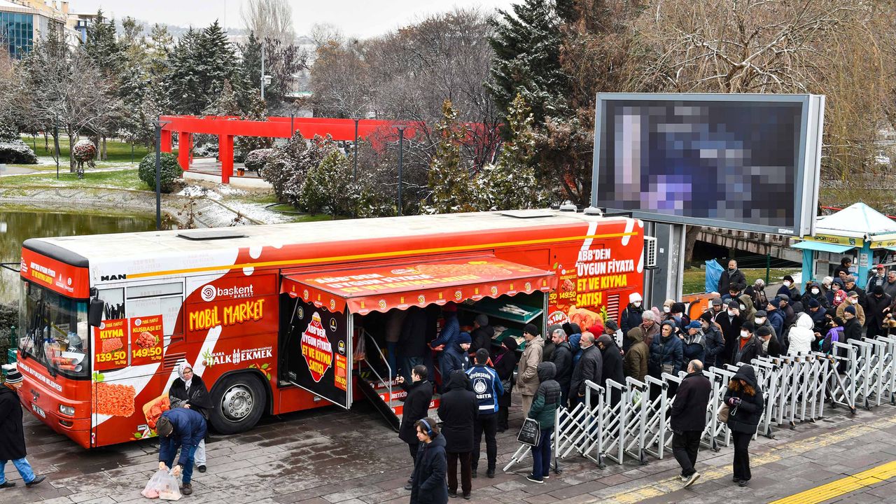 Ankara Büyükşehir Belediyesi, Ramazan ayında vatandaşların uygun fiyatlarla et ve kıyma alabilmesi için Başkent Mobil Market ile satış yapıyor. Zorlu ekonomik koşullarda vatandaşın yanında olmaya devam eden belediye, et ve kıyma satışını Başkent Marketlerin yanı sıra, EGO otobüsünden dönüştürülen Başkent Mobil Market aracılığıyla çevre ilçelere de taşıyor.