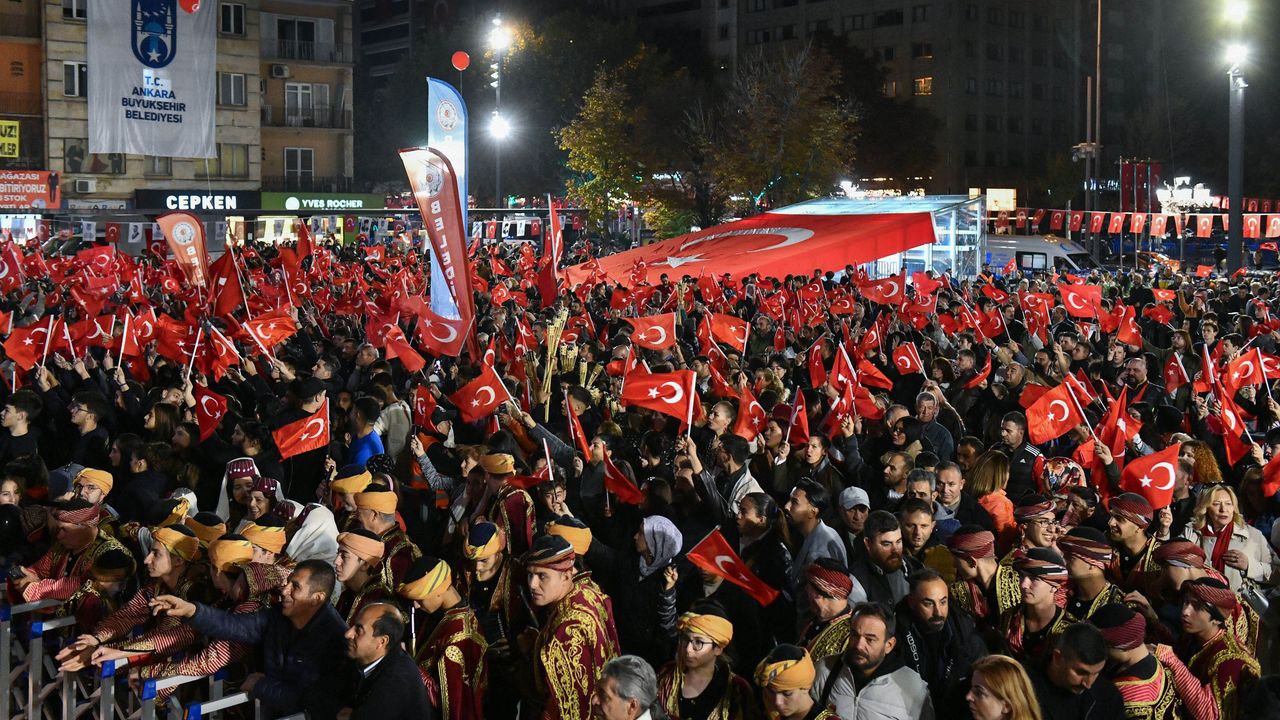 Mareşal Atatürk Anıtı’ndan Birinci Meclis’e kadar meşalelerle yürüyen vatandaşlar, ellerinde Türk bayraklarıyla Cumhuriyet marşlarını hep bir ağızdan söyledi. ABB Başkanı Mansur Yavaş da kortejde yer alarak vatandaşlarla birlikte yürüdü.