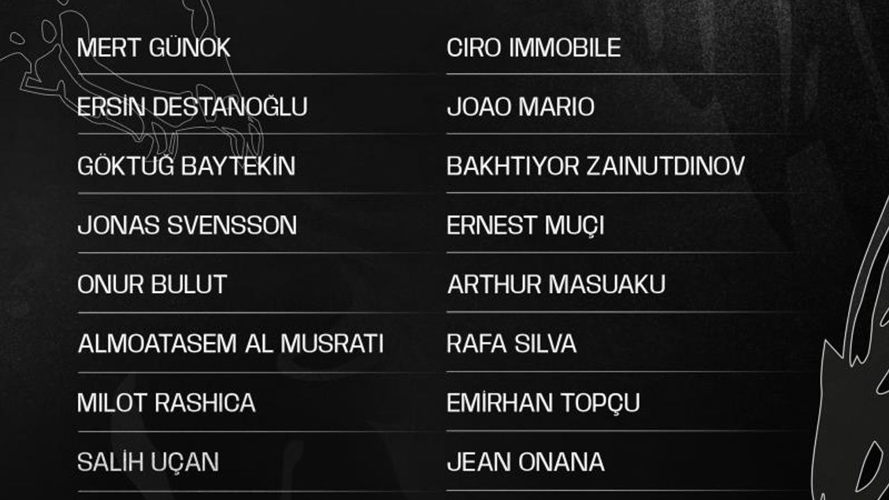 "Mert Günok, Ersin Destanoğlu, Göktuğ Baytekin, Jonas Svensson, Onur Bulut, Al-Musrati, Milot Rashica, Salih Uçan, Semih Kılıçsoy, Felix Uduokhai, Alex-Oxlade Chamberlain, Ciro Immobile, Joao Mario, Bakhtiyor Zainutdinov, Ernest Muçi, Arthur Masuaku, Rafa Silva, Emirhan Topçu, Jean Onana, Cher Ndour, Gedson Fernandes ve Mustafa Hekimoğlu."