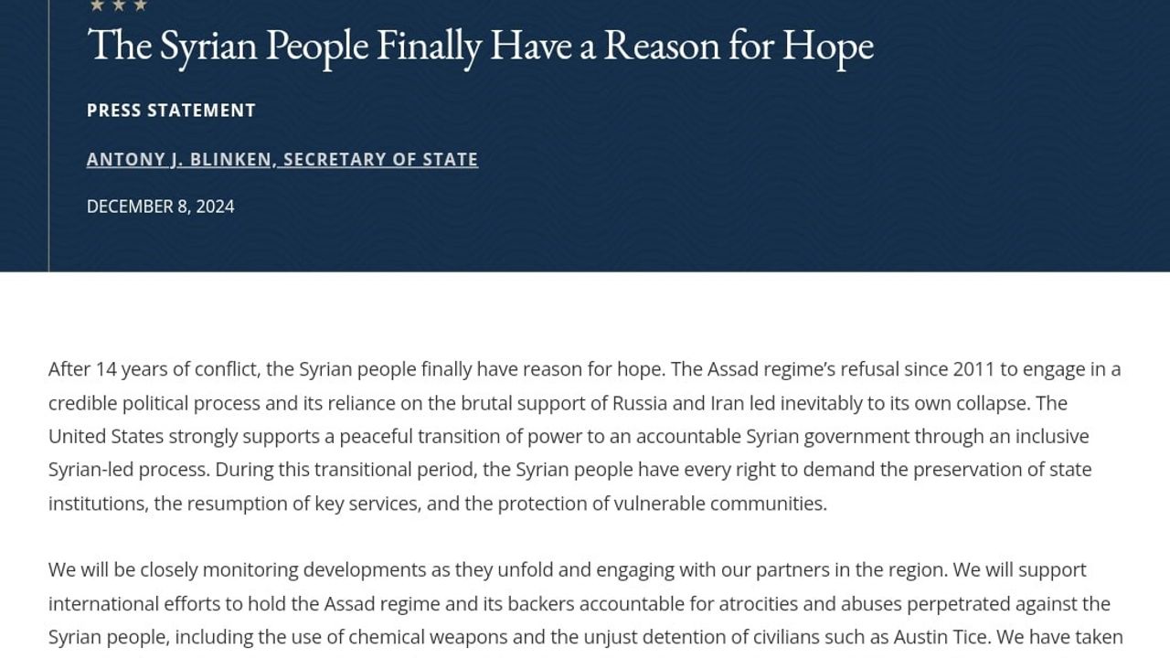 ABD Dışişleri Bakanı Antony Blinken, Suriye halkının 14 yıl süren çatışmaların ardından nihayet umutlanmak için bir nedeninin olduğunu belirterek, “ABD, Suriye liderliğindeki kapsayıcı bir süreç yoluyla iktidarın hesap verebilir bir Suriye hükümetine barışçıl yollardan devrini güçlü bir şekilde desteklemektedir” dedi.