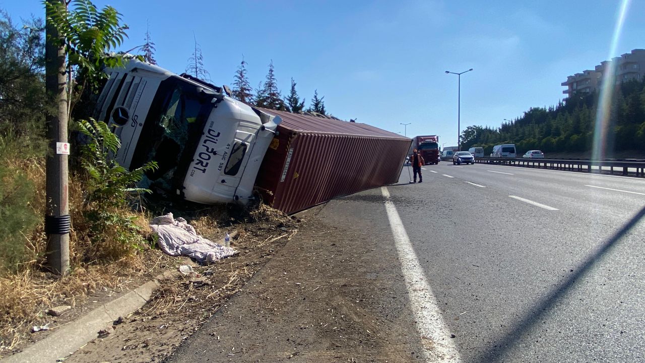 Bursa'nın Kestel ilçesinde kontrolden çıkan tır, bariyerlere çarparak devrildi. Kazada tır sürücüsü yaralandı.