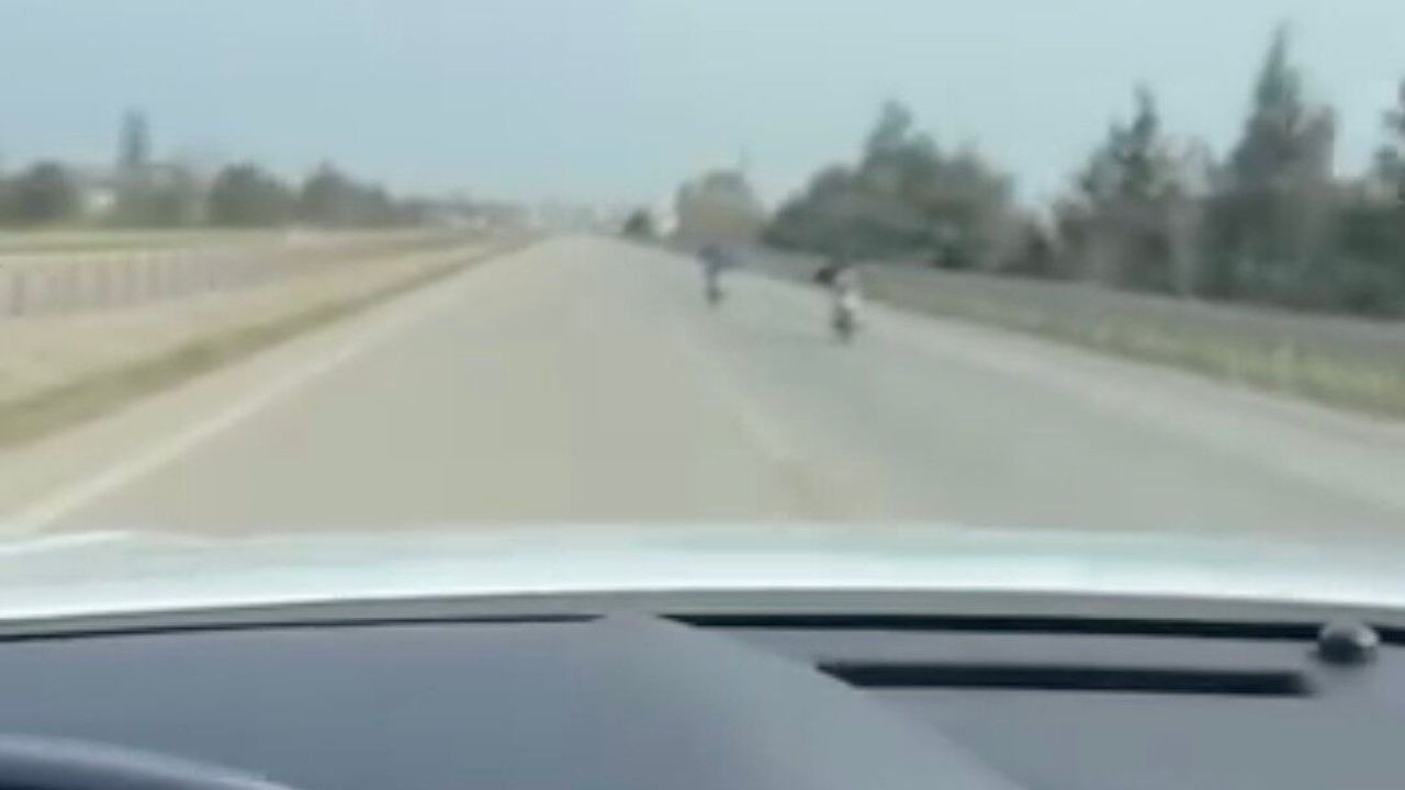Karacabey-Bandırma karayolunda seyir halinde olan bir vatandaş tarafından cep telefonu ile kaydedilen görüntülerde, iki motosiklet sürücüsünün motosiklet üzerine yüzüstü uzanarak ilerlediği görüldü. Görüntüyü kaydeden aracın hız göstergesinde ise hızın yaklaşık 115 kilometre olduğu dikkat çekti. Trafikte adeta ölümle yarışan motosiklet sürücülerinin, bu hızda yaptıkları tehlikeli hareketlerle hem kendi hayatlarını hem de diğer sürücülerin can güvenliğini tehlikeye attığı görüldü.
