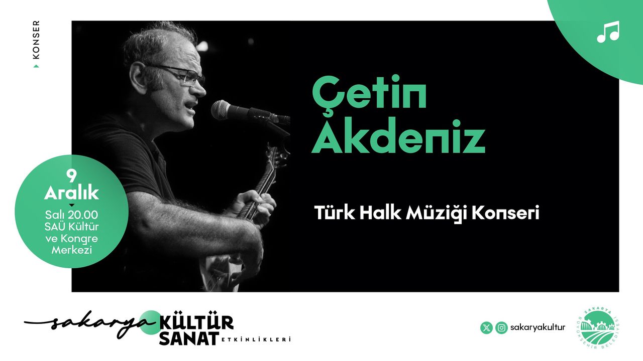 Sakarya Büyükşehir Belediyesi Kültür ve Sosyal İşler Dairesi Başkanlığı tarafından düzenlenen Aralık Kültür Sanat Takvimi, Türk Halk Müziği severler için özel bir etkinliğe ev sahipliği yapacak. Türk Halk Müziği'nin usta ismi Çetin Akdeniz, 9 Aralık Salı günü Sakarya'da sahne alacak. Anadolu'nun zengin ezgilerini sazıyla ve özgün yorumuyla buluşturan Akdeniz, dinleyicilere unutulmaz bir müzik ziyafeti sunacak.