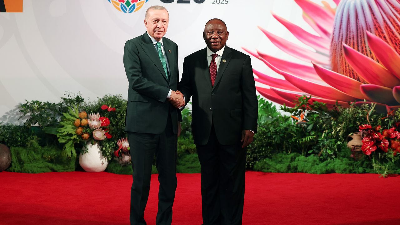 Cumhurbaşkanı Recep Tayyip Erdoğan, G20 Liderler Zirvesi kapsamındaki temasları için sabah saatlerinde Johannesburg’daki zirve alanına geldi. Zirvenin düzenlendiği Johannesburg Expo Center'a gelen Cumhurbaşkanı Erdoğan, G20'ye ev sahipliği yapan Güney Afrika Cumhurbaşkanı Cyril Ramaphosa tarafından karşılandı. Zirve merkezinin ana girişinde liderleri tek tek karşılayan Ramaphosa, Cumhurbaşkanı Erdoğan’la kısa bir sohbet gerçekleştirdi.Ramaphosa ve Erdoğan, tokalaşarak hatıra fotoğrafı çektirdi.