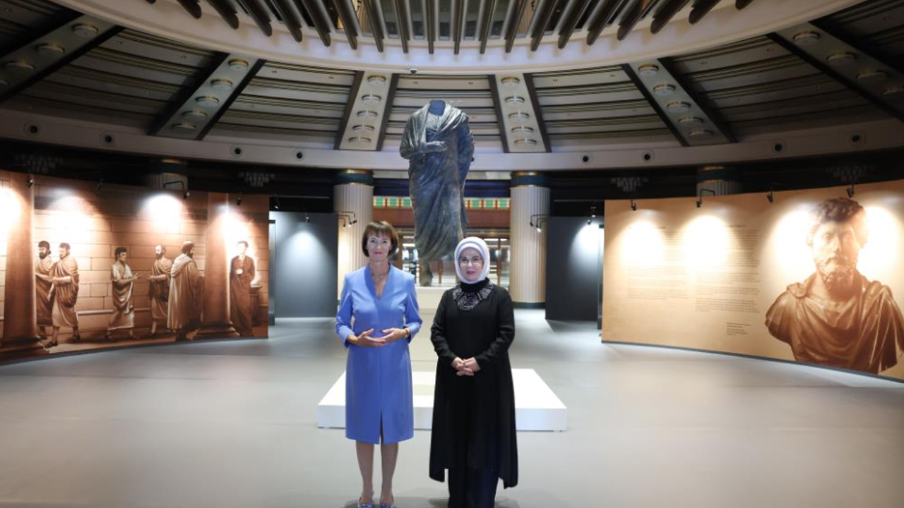 Lider eşleri daha sonra Cumhuriyet tarihinin en kapsamlı arkeoloji projesi "Geleceğe Miras" kazılarıyla bulunan eserlerin yer aldığı "Arkeolojinin Altın Çağı Sergisi"ni gezdi. Burdur'daki Boubon Antik Kenti'nde 1960'lı yıllarda yapılan kaçak kazılar sonucu yurt dışına çıkarılan ve 65 yıl aradan sonra Türkiye'ye getirilen, MS 2. ve 3. yüzyıllara tarihlenen Roma İmparatoru Marcus Aurelius bronz heykelin de yer aldığı sergiyi ilgiyle gezen Emine Erdoğan ve Charlotte Merz, eserler hakkında bilgi aldı. Lider eşleri, kütüphane ziyaretinin ardından Devlet Konukevi'ne geçerek burada ikili görüşme gerçekleştirdi.