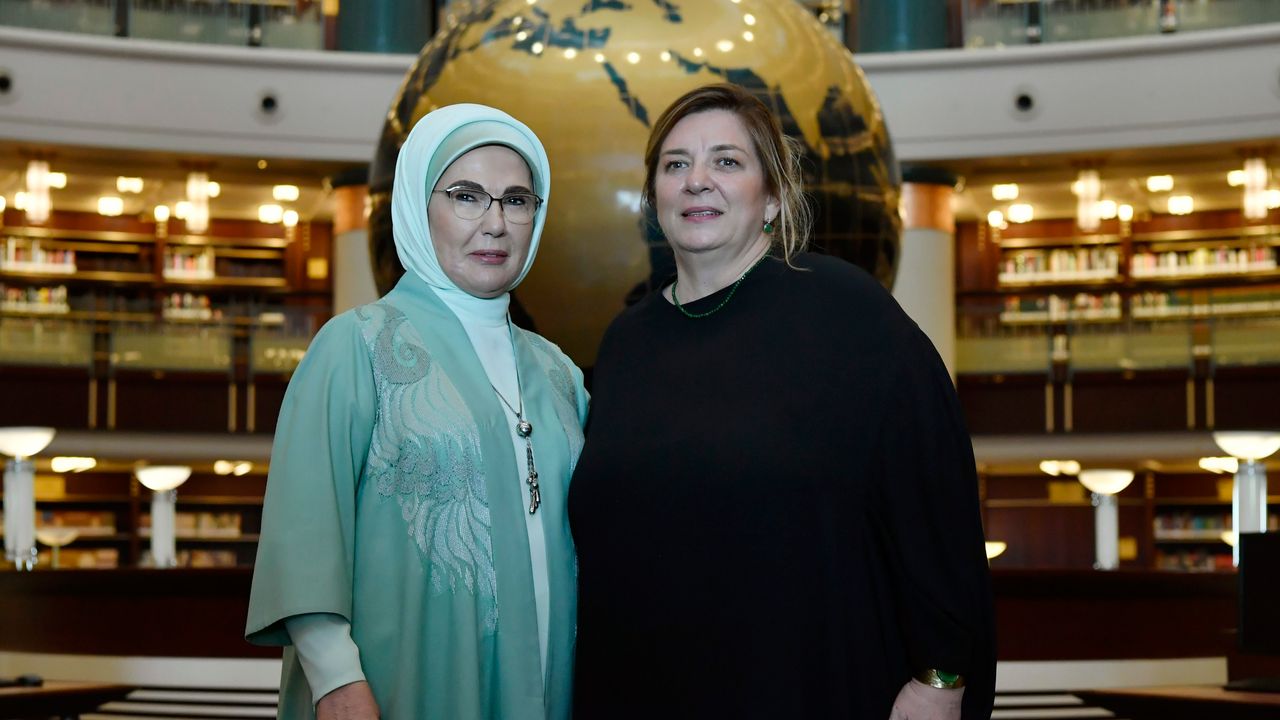 Liderlerin eşleri, Cumhurbaşkanlığı Külliyesi'nde yer alan Devlet Konukevi'ndeki görüşmelerinin ardından Cumhurbaşkanlığı Millet Kütüphanesi'ne geçti.