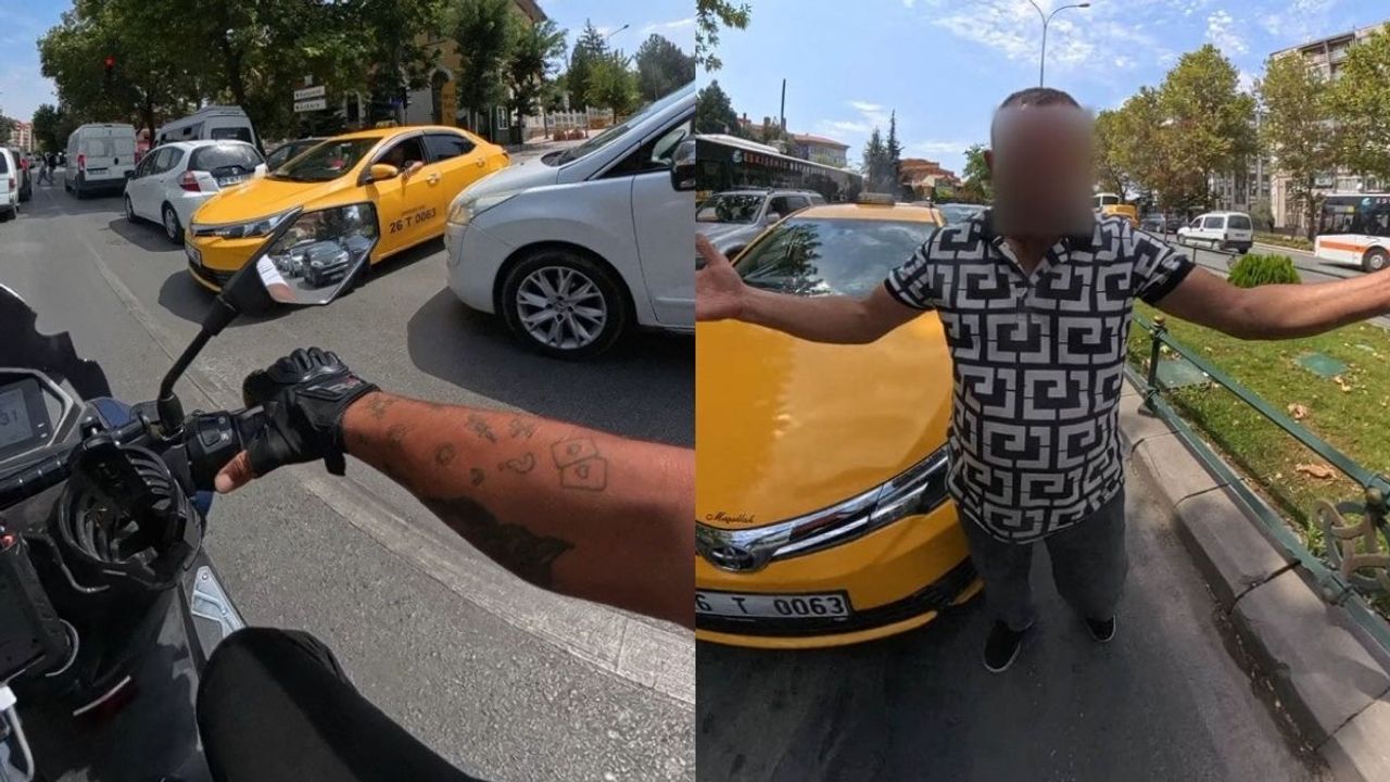 Odunpazarı ilçesi Atatürk Bulvarı üzerinde trafikte seyreden bir kurye, araçların arasından bir anda çıkan taksiyle kafa kafaya geldi. Kazadan yaptığı hamle ile kurtulan motosikletli kurye, taksi şoförüne tepki gösterdi. Tepkisi sonrasında aracından inen taksi şoförü ile kurye arasında kısa süreli ağız dalaşı yaşandı. Ağız dalaşının arbedeye dönüştüğü olayda, tarafları çevredeki vatandaşlar ayırdı. Kavga anı motosikletli kuryenin kask kamerasına anbean yansıdı.