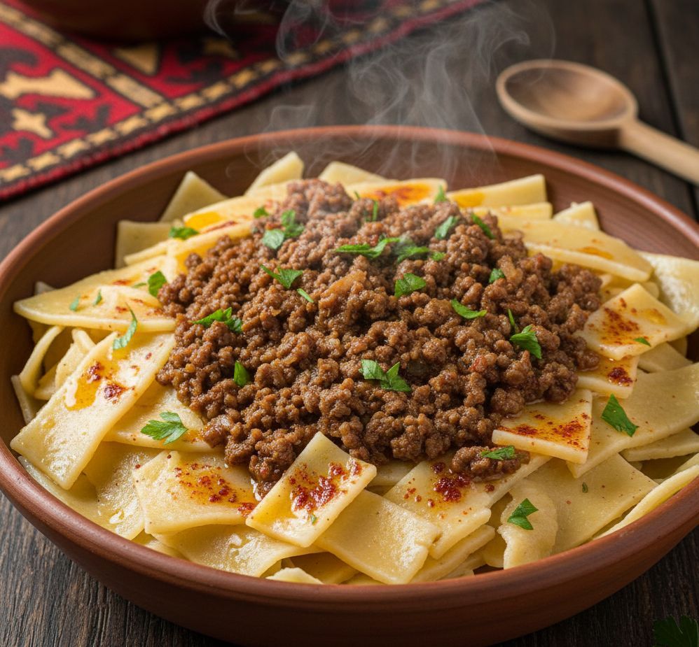 Eriştenin haşlanıp üzerine kavrulmuş kıymanın eklenmesiyle yapılan bu pratik ama çok lezzetli yemek, Ankara evlerinde sıkça pişen geleneksel bir ana yemektir.