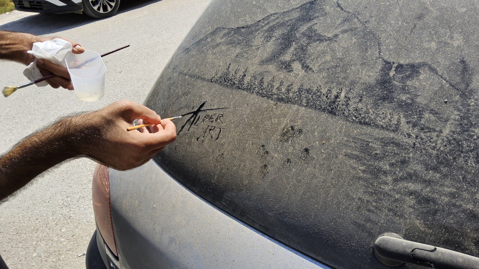 Alper Kocabıyık, sokakta gördüğü tozlu araçları bir tuval gibi görüyor. Cam üzerindeki toz tabakası, onun için eşsiz bir sanat zemini oluşturuyor.