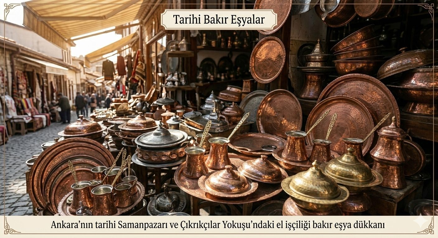 Samanpazarı ve Çıkrıkçılar Yokuşu’nun vazgeçilmezi olan el işçiliği bakır cezveler, tepsiler ve sahanlar, mutfağına nostaljik bir hava katmak isteyenler için birebir.