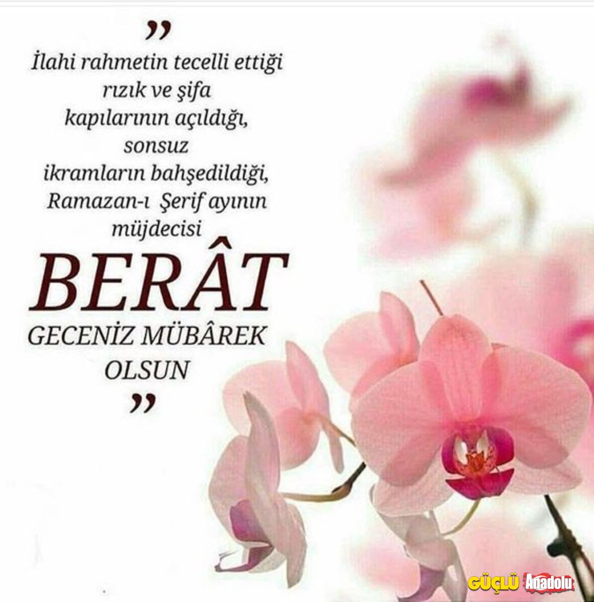 Berat, kötülükten ve çirkinlikten berî olmak demektir. Rahmet ve mağfiret ayı olan Ramazan'ın müjdecisidir. Berat gecemiz iyiliğe, güzelliğe, mağfirete, arınmaya ve kurtuluşa vesile olsun. Berat Kandiliniz mübarek olsun.