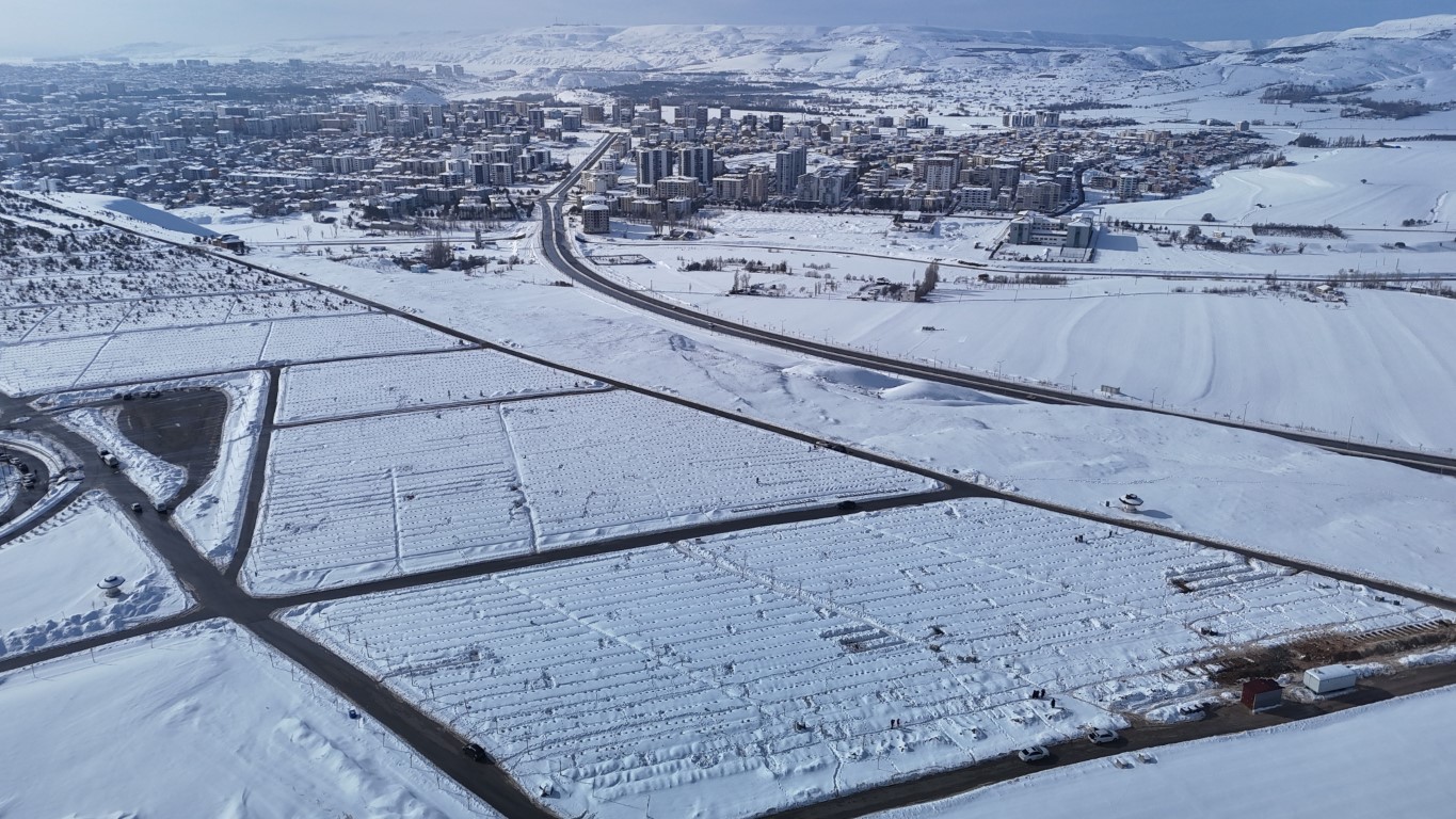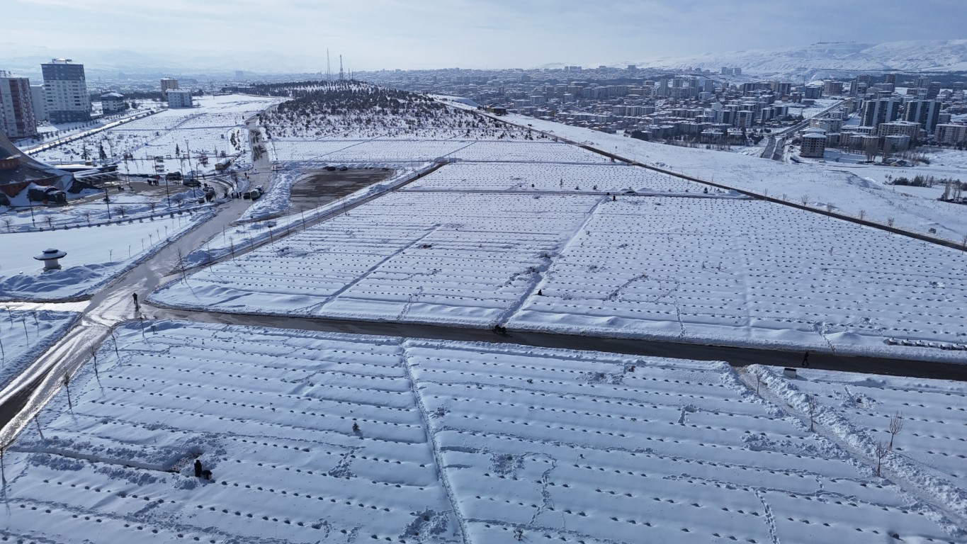 Kent genelinde birçok nokta beyaz örtüyle kaplanırken, şehrin en büyük mezarlıklarından biri olan Yukarı Tekke Mezarlığı da kar altında kaldı.