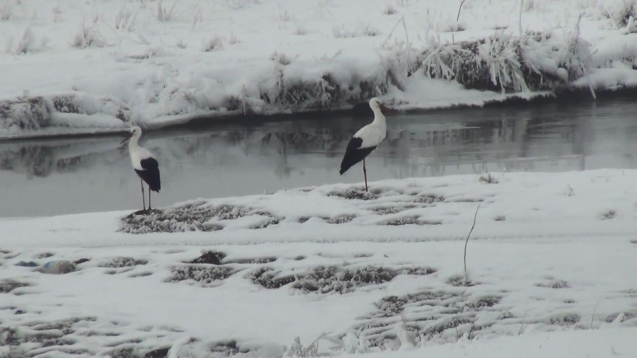 Kars'ta kış şartlarının etkisini göstermesiyle birlikte göç edemeyen leylekler, karla kaplı doğada görüntülendi. Kars Çayı'nın kenarında eksi 15 derece soğukta bölgeden ayrılmayan leylekler, çevredeki vatandaşların dikkatini çekti.