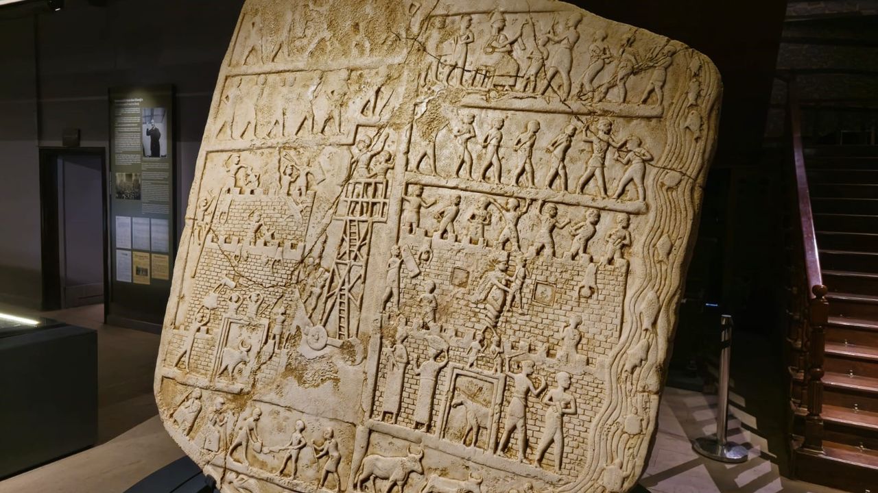 Kabartmada, surlu ve çift kapılı kale önünde bulunan tekerlekli kuşatma kulesi, kuşatma için çalışan lağımcılar, merdivenle surlara tırmanan askerler, savaşçılar gibi çeşitli askeri sınıflar görülüyor. Zapt edilen kaleden çıkan esirler ile asker esirlerin huzura kabulü kabartmanın ilginç konuları arasında dikkat çekiyor. Kale kapılarının biri üzerinde kanatlı ve portal pençeli mitolojik tanrıça figürü, elinde bir çocuk tutar vaziyette betimleniyor.