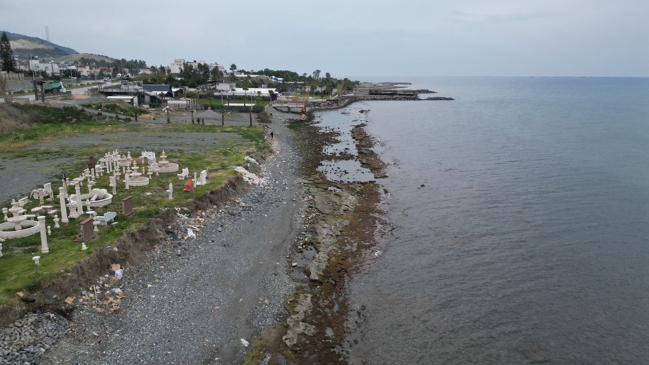 Hatay'ın Arsuz ilçesinde yaşanan 20 metre deniz çekilmesi dron ile havadan görüntülendi.