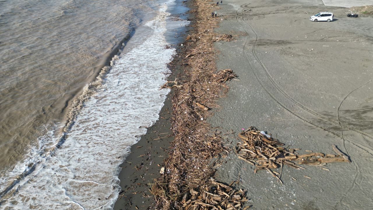 Hatay'ın kıyı ilçelerinde etkili olan şiddetli yağış Akdeniz’in kıyılarını kütüklerle kaplarken, denizin rengi kahverengiye döndü.