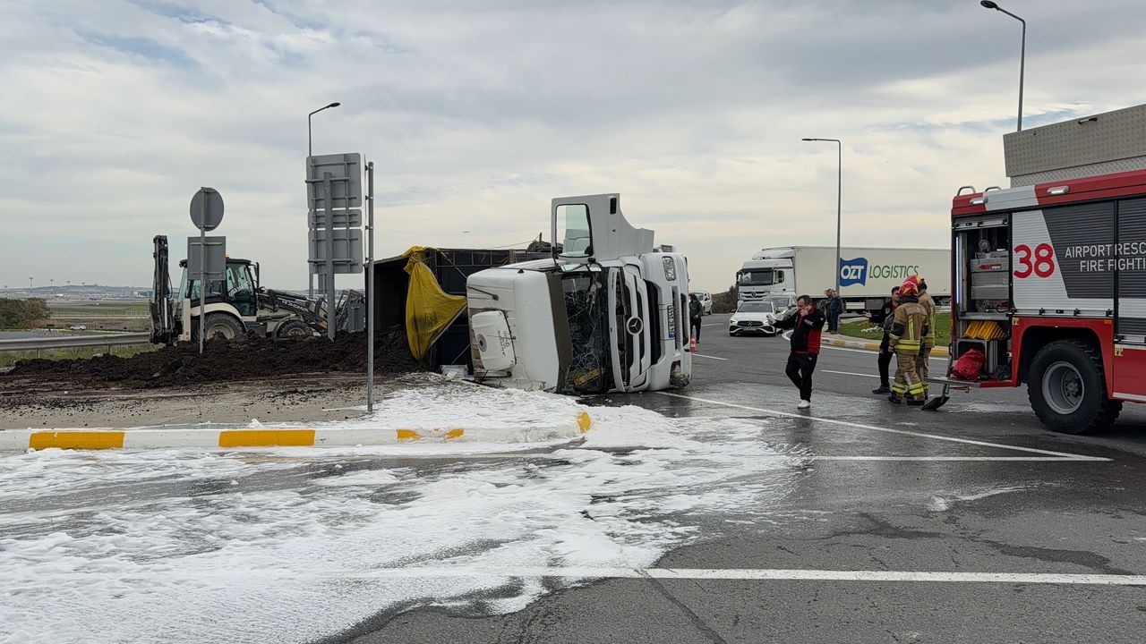İstanbul Havalimanı yolunda gübre yüklü bir hafriyat kamyonu, bağlantı kavşağına girdiği sırada kontrolden çıkarak yan yattı. Kazada kamyon şoförü yaralanırken, tonlarca gübre yola döküldü.