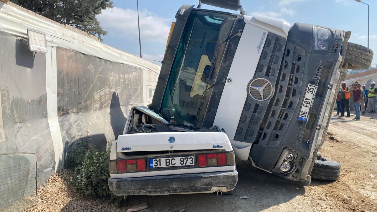 Kaza, Defne ilçesi Çekmece Mahallesi şantiye alanında yaşandı. Şantiye içerisinde seyir halindeki 06 FBY 351 plakalı Mercedes marka toprak yüklü kamyon, park halindeki 31 BC 873 plakalı Tofaş marka otomobilin üzerine devrildi. Kamyonun üzerine devrildiği otomobil hurda yığınına dönerek kullanılamaz hale geldi. Kamyonun üzerine devrildiği sırada otomobilde kimsenin olmaması muhtemel bir faciayı önledi.