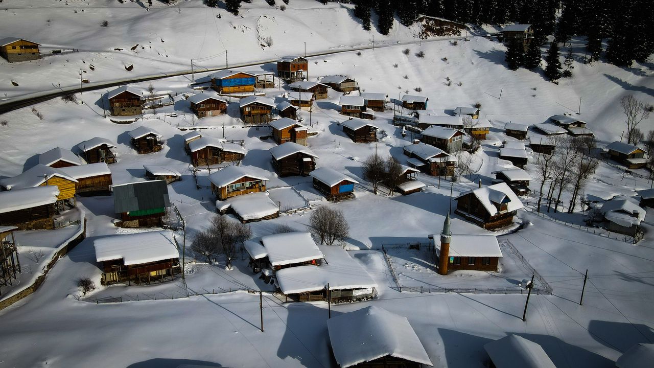 Doğal ve yaşlı ormanlar içinde yer alan ladin, sarıçam ve köknar ağaçlarının etrafına kurulan yayla evlerinin çatıları karla kaplanırken, karayolunda seyahat edenler durup, yol kenarından bol bol fotoğraf çekiyor.