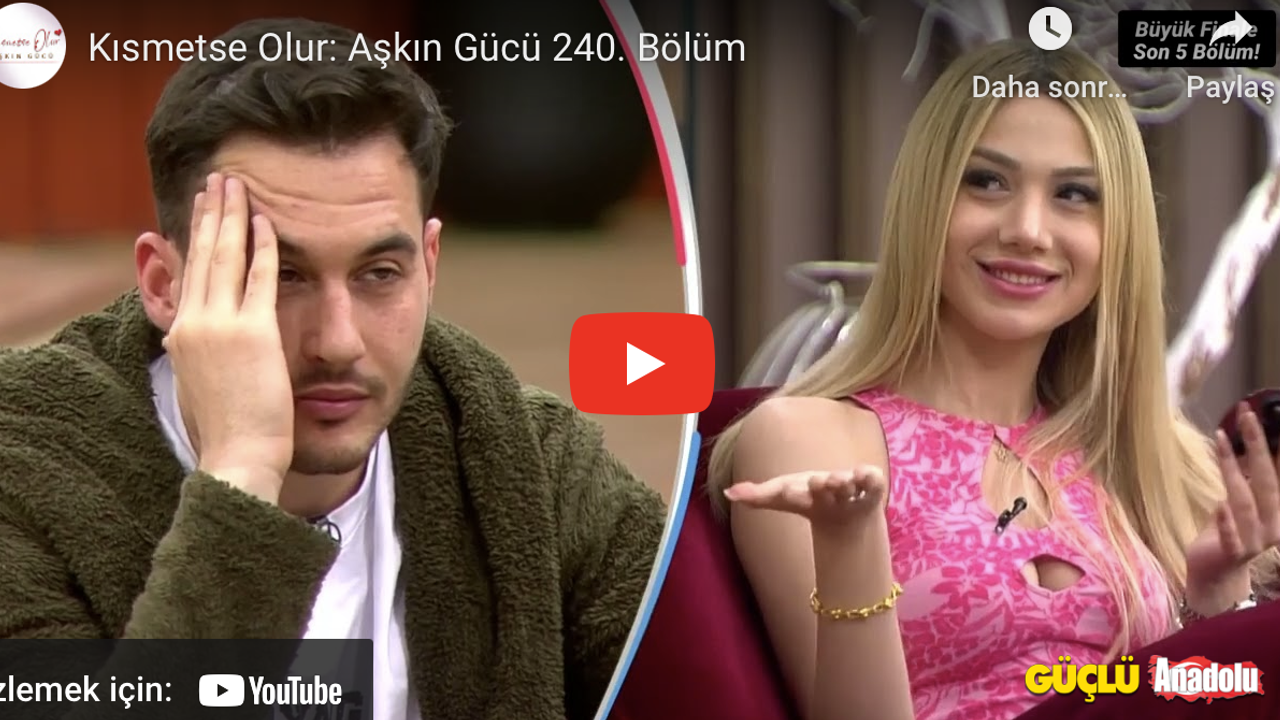 Bir zamanlar televizyon ekranlara damgasını vuran izdivaç programı Kısmetse Olur, yasaklanmasının ardından yeni ismiyle ve yeni platformunda izleyici karşısına çıkmaya başladı. Haftanın 6 günü YouTube kanalından yayınlanan programın büyük bir izleyici kitlesi var. Kullanıcılar, Kısmetse olur son bölüm İZLE aramasını gerçekleştiriyor. İşte Kısmetse olur son bölüm İZLE! Kısmetse olur 240. Bölüm İZLE! Kısmetse Olur : Aşkın Gücü 240. Bölüm son bölüm Full HD izle!
