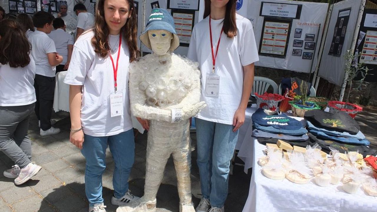 Burhaniye’de Faruk Kızıklı İlkokulu Bahçesinde düzenlenen yıl sonu sergisine katılan 24 okulun öğrencileri, bir yıl boyunca hazırladıkları eserleri sergilerken. Celal Toraman Anadolu Lisesi öğrencileri de stantta atık malzemelerden yaptıkların ürünlere yer verdi. Eski kotlardan çanta ve şapkalar yapan öğrencilerin, atık pet şişe ve bardaklardan yaptığı heykel de ilgi odağı oldu. Heykele, Muhteşem adını veren Sudenur Muslu ve Eda Bekiroğlu, heykelin büyük ilgi gördüğünü söyledi. Sergide hep atık ürünlerden hazırlanan ürünlerin yer aldığını kaydeden, Sudenur Muslu, "Sergimizde yer alan ürünlerin tamamı atık malzemelerden yapıldı. Eski kotlardan çanta ve şapkalar yaptık. Atık yağlardan da sabunlar yaptık. Atık pet şişe ve bardaklardan da insan heykeli yaptık. Adını da Muhteşem koyduk. Heykelimiz ilgi gördü. Bu ilgi de bizi mutlu etti" dedi.