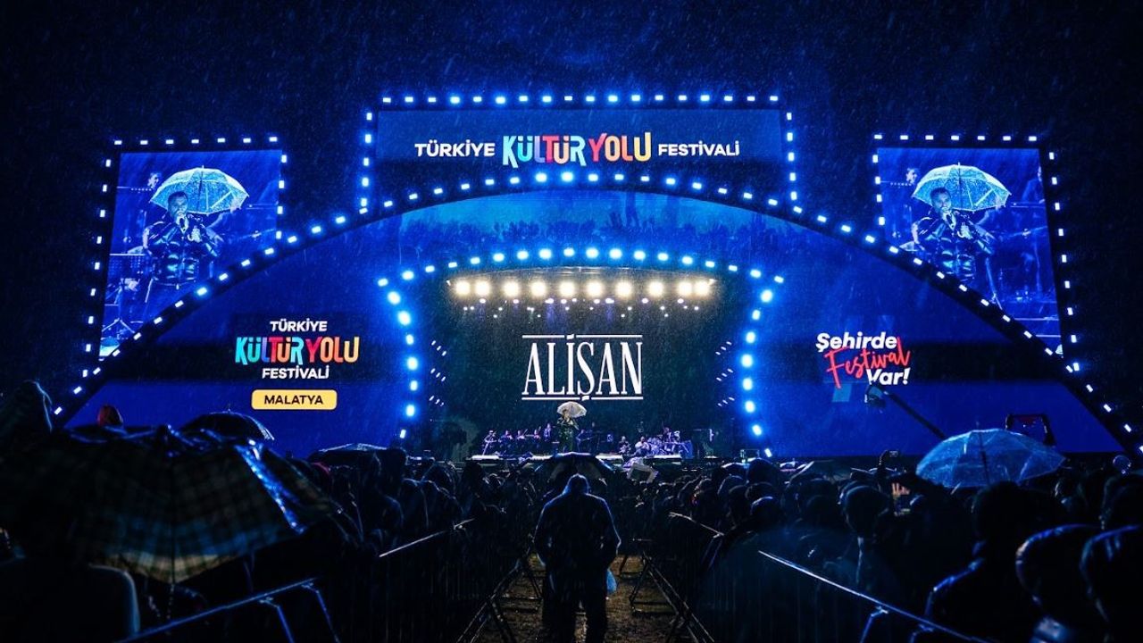 Türkiye Kültür Yolu Festivali kapsamında Malatya’da sahne alan ünlü sanatçı Alişan, sağanak yağmura rağmen sevenlerine unutulmaz bir konser verdi.