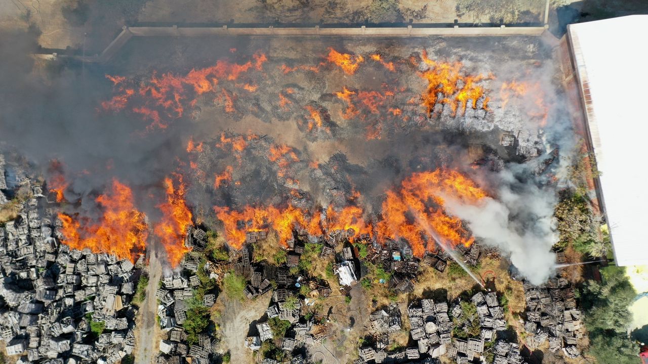 Manisa'nın Yunusemre ilçesindeki ahşap palet fabrikasındaki yangına itfaiye ekiplerinin müdahalesi devam ederken yangının büyüklüğü havadan görüntülendi.