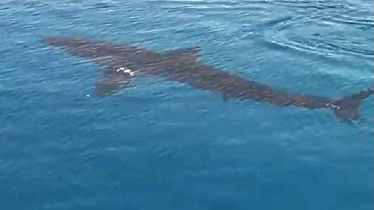Çanakkale'nin Gökçeada ilçesi açıklarında avlanan balıkçılar, oltalarına takılan dev köpek balığıyla büyük şaşkınlık yaşadı. Yaklaşık 2,5 metre boyunda ve 100 kilogram ağırlığında olduğu tahmin edilen mavi köpek balığı, kısa süreli mücadelenin ardından tekrar denize bırakıldı.