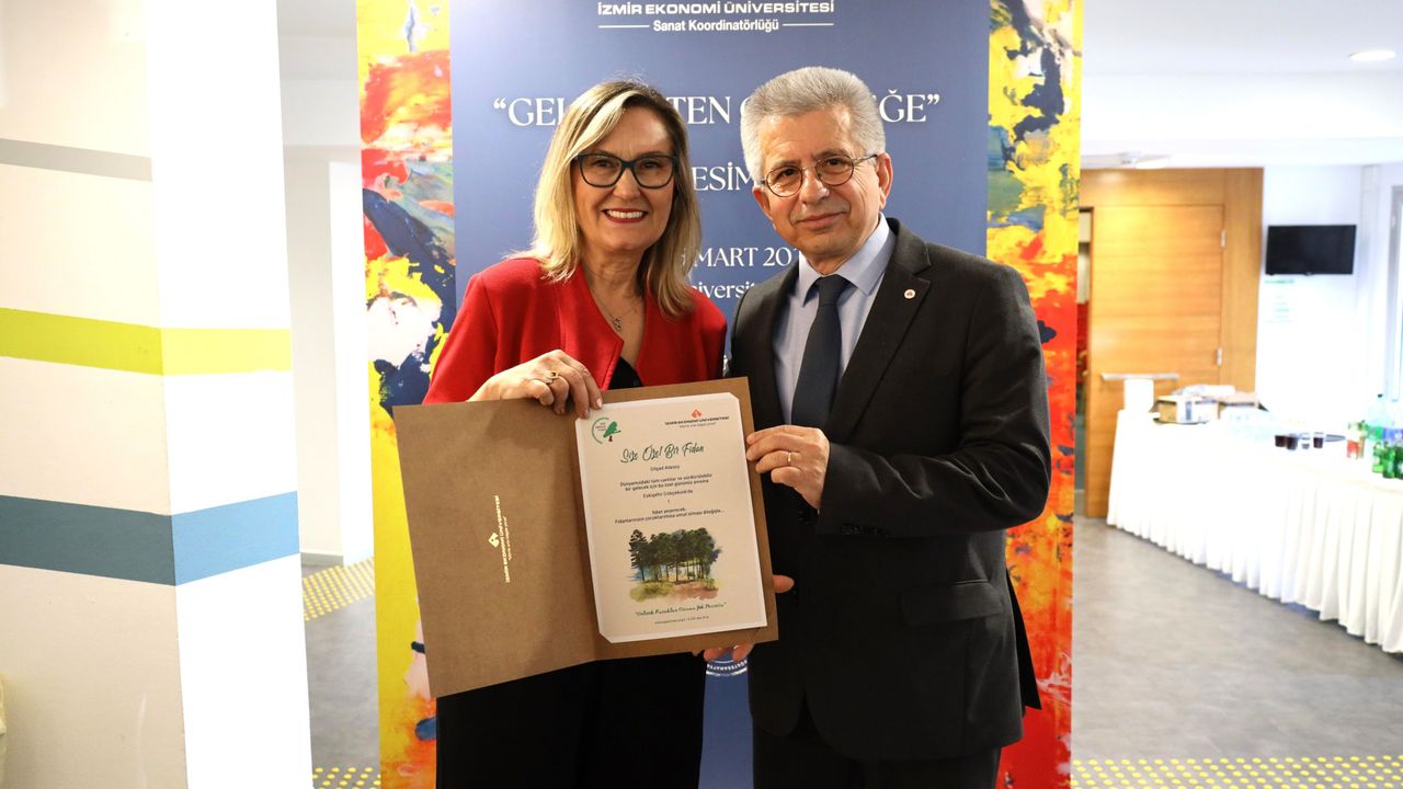 İEÜ Sanat Koordinatörü Sinemis Eser Akaoğlu’nun düzenlediği, proje koordinatörlüğünü Ressam Dilşad Atasoy’un yaptığı ve 37 ressamın eserlerinin yer aldığı ‘Gelenekten Geleceğe’ isimli resim sergisinin açılış töreni, büyük coşkuyla gerçekleşti. İEÜ Rektörü Prof. Dr. Yusuf Hakan Abacıoğlu tarafından sanatçılara, adlarına Ege Orman Vakfı’na bağışlanan fidanlar anısına birer sertifika takdim edildi.