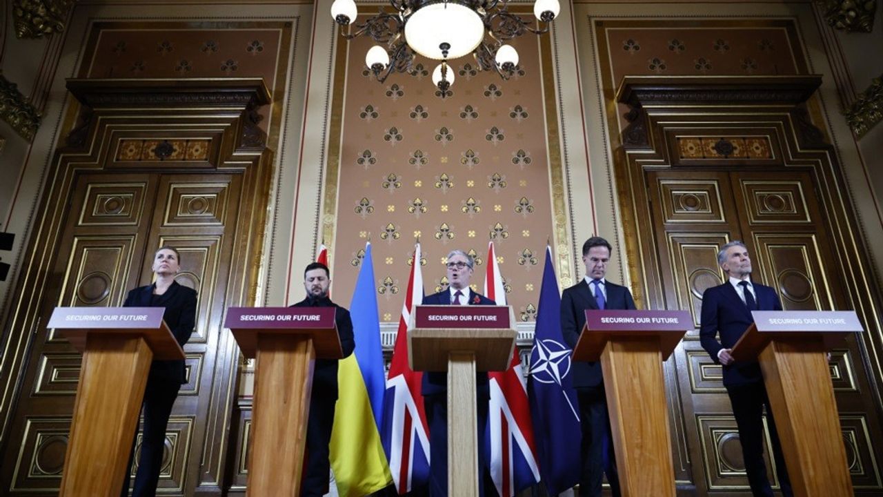 İngiltere Başbakanı Keir Starmer, Ukrayna Devlet Başkanı Vladimir Zelenskiy, Danimarka Başbakanı Mette Frederiksen, Hollanda Başbakanı Dick Schoof ve NATO Genel Sekreteri Mark Rutte, İngiltere’nin başkenti Londra’da gerçekleştirilen Gönüllüler Koalisyonu toplantısının ardından ortak basın toplantısı düzenledi.