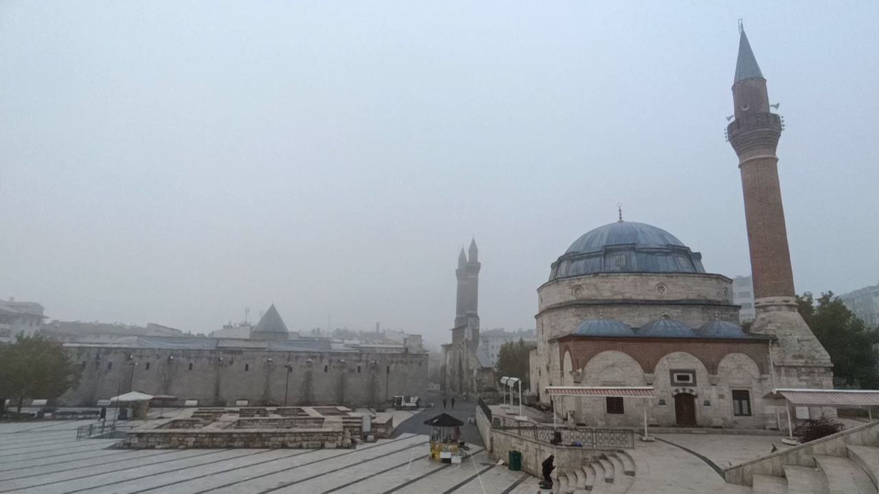 Sivas'ta sabah saatlerinden itibaren etkili olan yoğun sis, kentin üzerine adeta perde çekti. Tarihi kent meydanı sisin ardında gözden kayboldu.