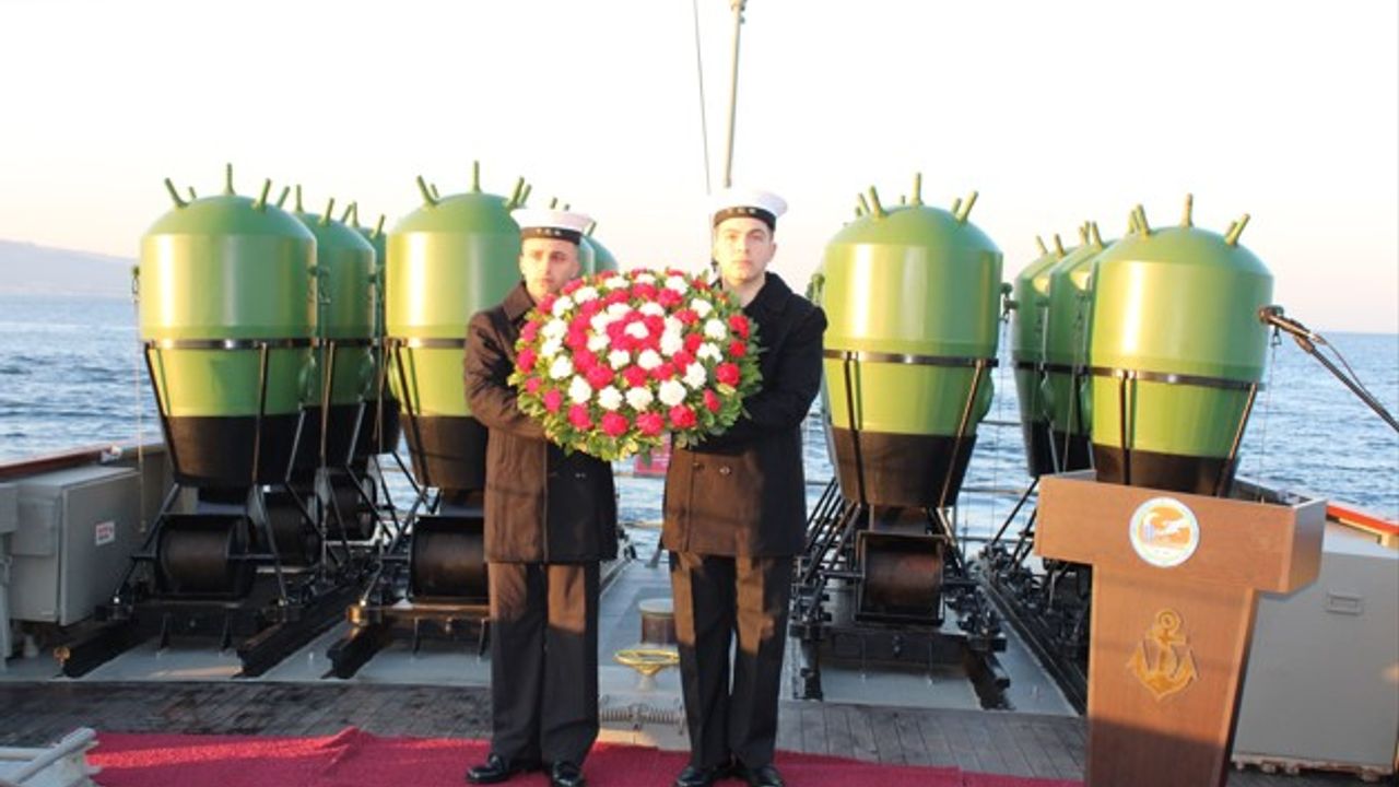 Çanakkale'deki ‘TCG Nusret' Gemisi, 110 yıl önce Deniz Savaşları'nın önemli unsurlarından Nusret Mayın Gemisi'nin rotasını izleyerek, mayın dökülen hatta bu kez çelenk bıraktı.
