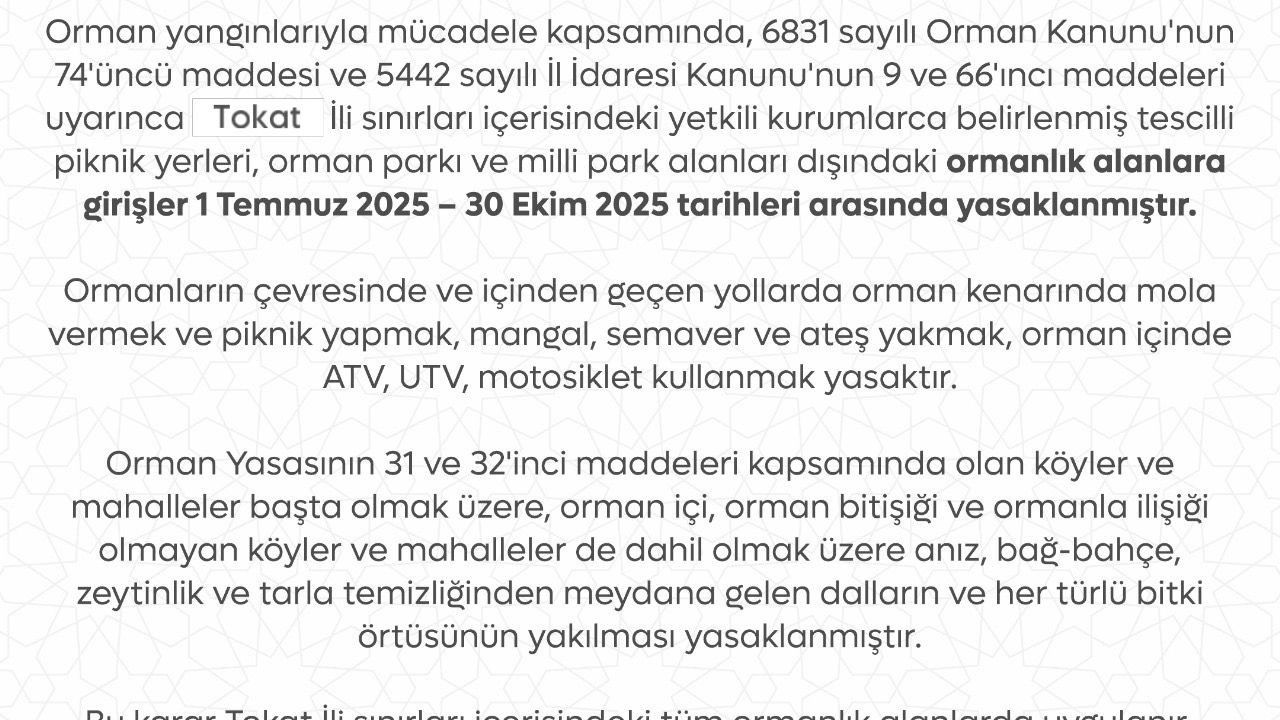 Tokat Valiliği, yaz mevsimiyle birlikte artan sıcaklıklar ve muhtemel yangın riskine karşı yeni tedbirleri kamuoyuyla paylaştı. Valilik tarafından yapılan açıklamada, 6831 sayılı Orman Kanunu ile 5442 sayılı İl İdaresi Kanunu uyarınca alınan kararla, Tokat il sınırları içerisinde belirlenen tescilli piknik alanları, orman parkları ve milli park alanları dışındaki tüm ormanlık alanlara girişlerin 1 Temmuz - 30 Ekim 2025 tarihleri arasında yasaklandığı duyuruldu.