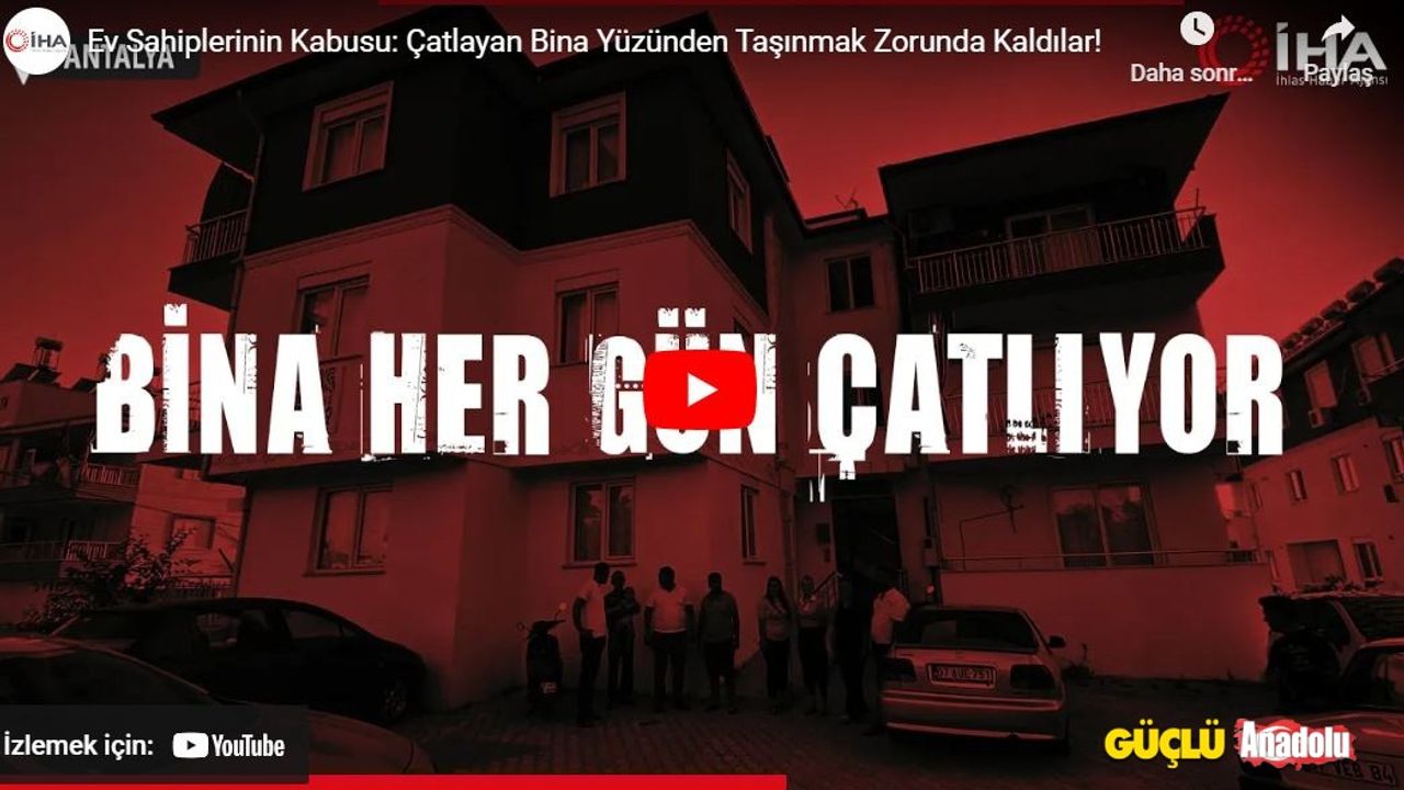 Her akşam binada oluşan çatırdama sesinden dolayı bazı ev sahipleri binadan taşınmak zorunda kaldı. Serik ilçesinde ev sahibi olmayı hayal eden vatandaşlar, 5 yıl önce Kökez Mahallesi’nde bir müteahhitle anlaştı....