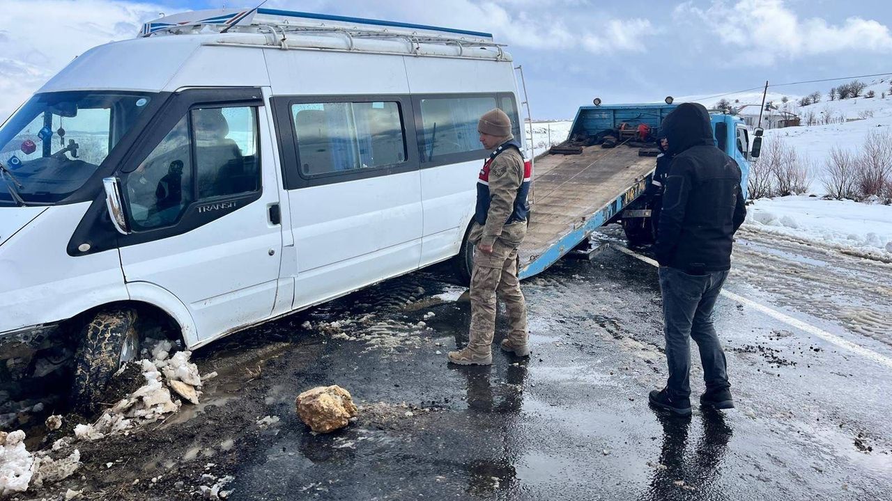 Elazığ’da yoğun kar yağışından dolayı şarampole sürüklenen minibüs, jandarma ve il özel idaresi ekipleri tarafından kurtarıldı.